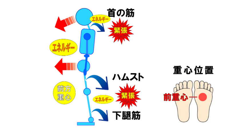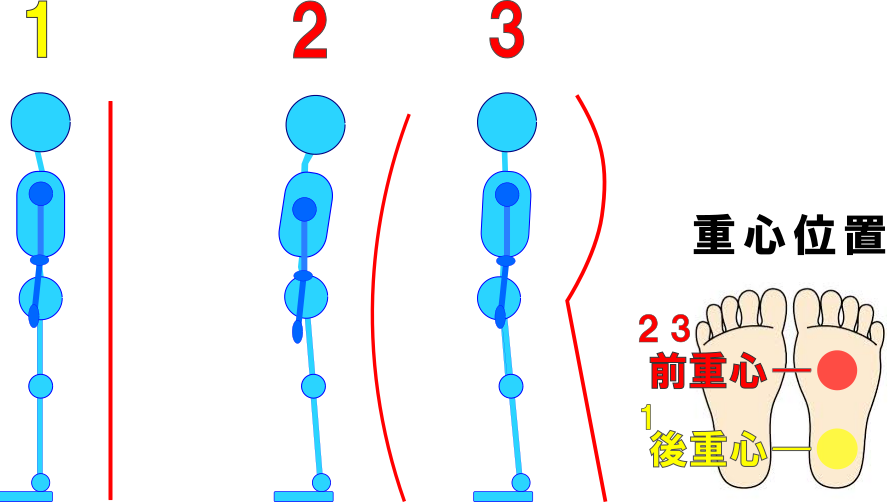 前重心は反り腰・猫背となりつま先母指球に荷重 |